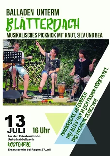 XX.07.2026 Im Juli gibt es wieder Baladen unterm Blätterdach mit Knut, Silv und Bea. Den genauen Termin gebe ich hier noch bekannt.